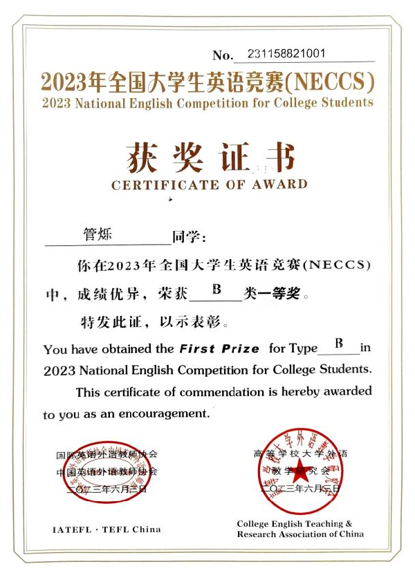近日,2023年全国大学生英语竞赛决赛结果揭晓,我校共44名同学获奖,其中一等奖3人,二等奖15人,三等奖26人。我院管烁荣获B类英语专业组一等奖,新闻与文法学院王俣玥、胡格菲同学荣获C类非英语专业组一等奖。