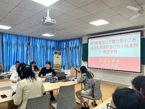 为认真学习贯彻落实教师职业行为十项准则要求,引导广大教师自律自强,形成自觉践行良好师德、维护良好师风学风的有利环境,持续完善师德师风建设长效机制,11月8日下午,外国语学院组织全体教职工集中学习了《教育部公开曝光第十三批7起违反教师职业行为十项准则典型案例》。该院副院长许敏领学,院长梁小华、党总支书记杨芳及全院教职工参加学习。