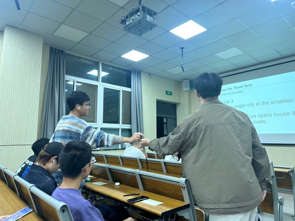 活动伊始,主持人李章琦用流利的英文介绍了活动目的与流程。紧接着的破冰小游戏迅速点燃了参与者的热情。“旅游地猜猜猜”环节,主持人用英语描述旅游地特色,“It's a city recently became famous because of the internet buzzword‘suanniao’ bird.”(有一座城市最近因为网络热梗“蒜鸟”而出名),大家纷纷抢答“Wuhan!”;“旅行经历接龙”时,参与者依次用英语分享旅行故事,有人讲在泰国清迈骑大象的奇妙,有人谈在澳大利亚悉尼歌剧院前的留影,后一位还会在前一位的经历上巧妙延伸,形成了一条充满趣味的旅行故事链。