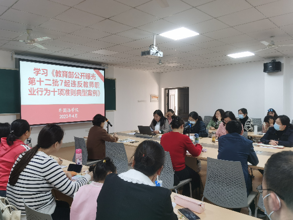 近日,教育部公开曝光第十二批7起违反教师职业行为十项准则典型案例。为了进一步加强师德师风建设,培养高素质教师队伍,4月26日下午,我院召开学习《教育部公开曝光第十二批7起违反教师职业行为十项准则典型案例》专题会议,该院党总支书记杨芳主持会议,全体教职工参加。